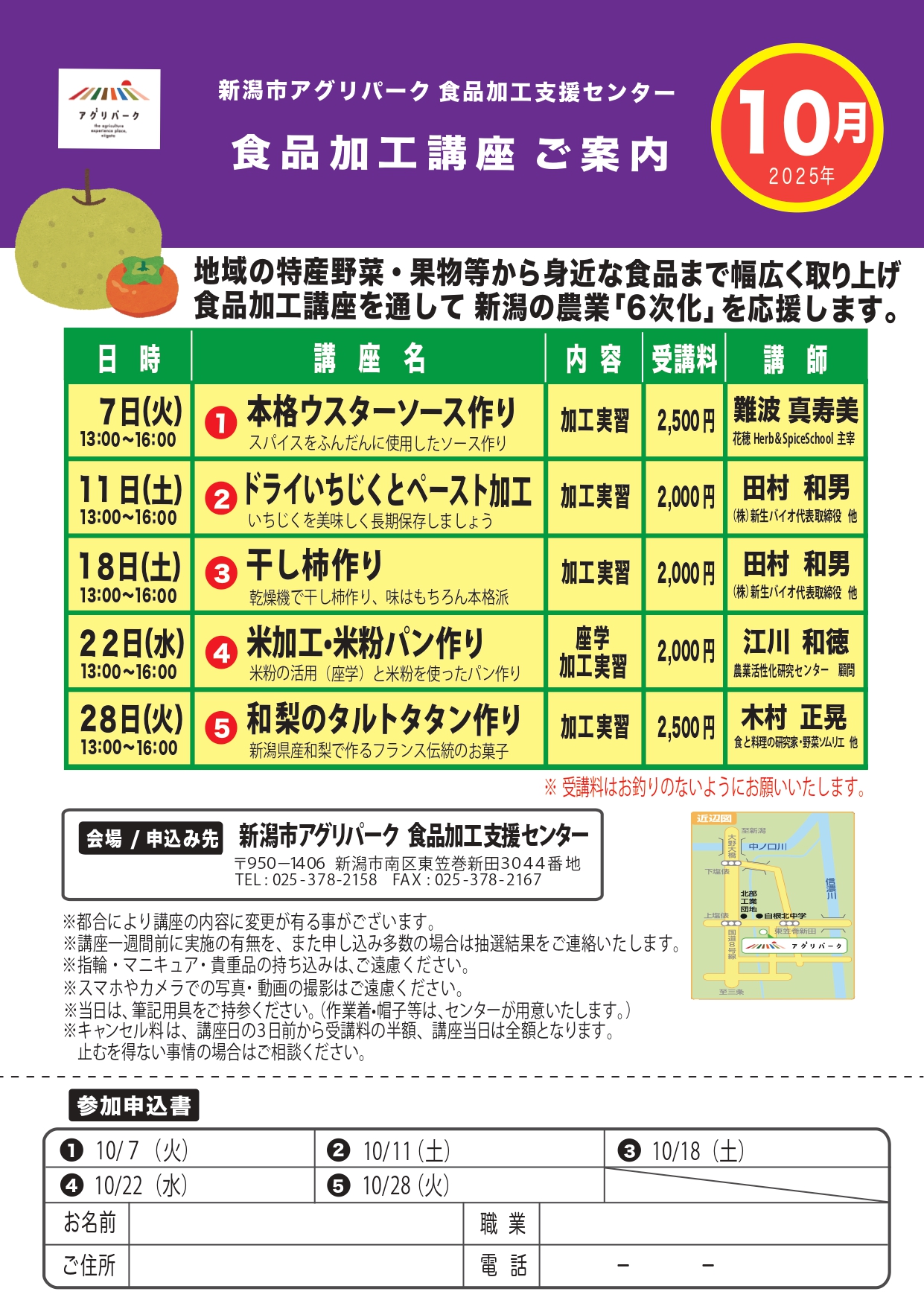 \ 詳しくはチラシをご確認ください / ※クリックで拡大します。 お問い合わせ、お申込み 新潟市アグリパーク 食品加工支援センター 〒950-1406 新潟市南区東笠巻新田3044 TEL 025-378-2158(受付時間 9:00~17:00)