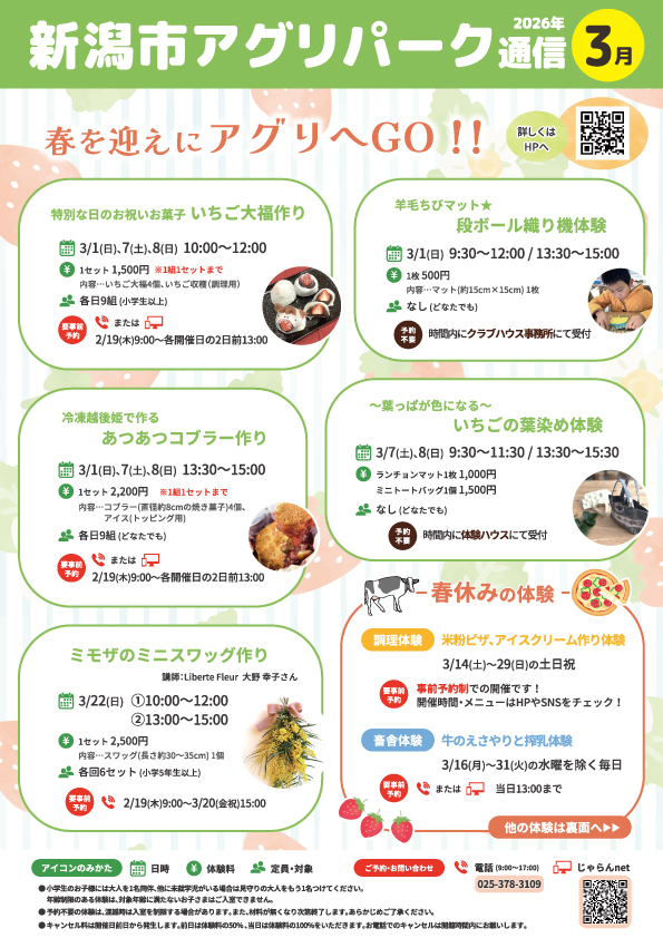 ※クリックで拡大します。3月のイベントカレンダーは、2月下旬に掲載予定です。 3月は、自分で収穫して作る「いちご大福作り」や捨てるはずだった葉を活用した「いちごの葉染め体験」など楽しいイベントが盛りだくさん! 記号のみかた 【¥】体験料 【定】定員・対象 ※記載のないものは定員なし・どなたでも 【物】持ち物 ※記載のないものは不要 【会】会場 【申】申し込み ●3/1(日)、7(土)、8(日) 10:00~12:00 特別な日のお祝いお菓子 いちご大福作り 毎年大人気!アグリパークのいちご大福作り♡ アグリパークで育てているいちご「越後姫」を自分で収穫して、生地も自分でつくります! 自分で選んだいちごを使って作るいちご大福の味は格別ですよ! 【¥】1セット1,500円 ※1組1セットまで 内容…いちご大福4個、いちご収穫(調理用) 【定】各日9組(小学生以上) 【物】エプロン、三角巾、ハンカチ、マスク 【会】受付:クラブハウス事務所 会場:クラブハウス調理室 【申】要事前予約 2/19(木)9:00~各開催日の2日前13:00 お電話またはじゃらんnetにてお申し込みください。 ●3/1(日) 9:30~12:00 / 13:30~15:00 羊毛ちびマット★段ボール織り機体験 1本の糸がどのように布になるか知っていますか? 人間に大切な衣食住。私たちが普段着ている服は1本の糸を織って作った布からできています。 アグリパークで飼育しているヒツジの毛を使って、布の作り方をぜひ体験してみてください。 【¥】1枚500円 内容…マット(約15cm×15cm)1枚 【会】受付:クラブハウス事務所 会場:クラブハウス学習室 【申】予約不要 受付時間内にクラブハウス事務所にお越しください。 ●3/1(日)、7(土)、8(日) 13:30~15:00 冷凍越後姫で作る あつあつコブラー作り さぁ!いちごのシーズン到来です。新潟のブランドいちご「越後姫」を主役にした、あつあつな外国の家庭料理「コブラー」を作ってみませんか? 生地をちぎって敷き詰めて、アグリパーク産の冷凍いちごを入れてオーブンで焼き上げます。 焼きたてはふんわりいちごの甘い香りに包まれます♪ 【¥】1セット2,200円 ※1組1セットまで 内容…コブラー(直径約8cmのマフィン型)4個、アイス1人前 【定】各日9組(小学生以上) 【物】エプロン、三角巾、ハンカチ、マスク 【会】受付:クラブハウス事務所 会場:クラブハウス調理室 【申】要事前予約 2/19(木)9:00~各開催日の2日前13:00 お電話またはじゃらんnetにてお申し込みください。 ●3/7(土)、8(日) 9:30~11:30 / 13:30~15:30 ~葉っぱが色になる~ いちごの葉染め体験 ビー玉やおはじき、輪ゴムを使って模様をアレンジ、いちごの葉っぱで染めたミニトートバッグやランチョンマットを作ろう♪ 春の花見やピクニックに、自分で染めたアイテムをお供にお出かけしよう! 【¥】ランチョンマット 1枚1,000円 ミニトートバッグ 1個1,500円 内容…ランチョンマット(約38cm×28cm) ミニトートバッグ(約20cm×20cm×マチ10cm) 【会】受付・会場:体験ハウス 【申】予約不要 受付時間内に体験ハウスにお越しください。 ●3/22(日) ①10:00~12:00 ②13:00~15:00 ミモザのミニスワッグ作り 講師:Liberte Fleur 大野 幸子さん 春がやって来ますね。3月~4月は黄色く可愛い花を咲かせるミモザの季節です。 そんな可憐なミモザとフレッシュなグリーンの植物を合わせて、春にピッタリなミモザのミニスワッグを作ってみませんか? 教えてくださるのはフラワーアレンジメント教室Liberte Fleurの大野幸子さんです。 【¥】1セット2,500円 内容…スワッグ(長さ約30~35cm)1個 【定】各回6セット(小学5年生以上) 【会】受付・会場:クラブハウス学習室 【申】要事前予約 2/19(木)9:00~3/20(金祝)15:00 お電話にてお申し込みください。 ●春休みの体験 【調理体験】米粉ピザ、アイスクリーム作り アグリパークで人気の野菜たっぷりピザ、フレッシュな牛乳でつくるアイス作り! 春休みからは事前予約制での開催となります。 【日時】3/14(土)~29(日)の土日祝 【申】要事前予約 ※開催時間・内容などの詳細は、後日HP・SNSにてご案内いたします。 【畜舎体験】牛のえさやりと搾乳体験 通常は土日祝での開催のところ、春休み期間中は水曜日を除く毎日開催します! 牛さんと近くで触れ合って、命の大切さを感じよう。 【日時】3/1(日)~15(日)の土日祝 および 3/16(月)~31(火)の水曜日を除く毎日 13:30~ ※所要:最大60分 【¥】1名600円 【定】各日25名(4歳以上) 【会】受付:クラブハウス事務所 会場:体験畜舎 【申】要事前予約 当日13:00まで お電話またはじゃらんnetにてお申し込みください。 注意事項 〈調理体験について〉 ・小学生のお子様には大人を1名同伴、他に未就学児がいる場合、見守りの大人をもう1名つけてください。 ・年齢制限がある場合は、対象年齢に満たないお子さまはご入室できません。 ・すべての調理体験は、衛生面および安全面の観点によりお持ち帰りいただけません。 〈すべての体験について〉 ・小学生以下のお子様には大人の同伴が必要です。 ・予約不要の体験は混雑時は入場制限があります。また、材料がなくなり次第終了しますのでご了承