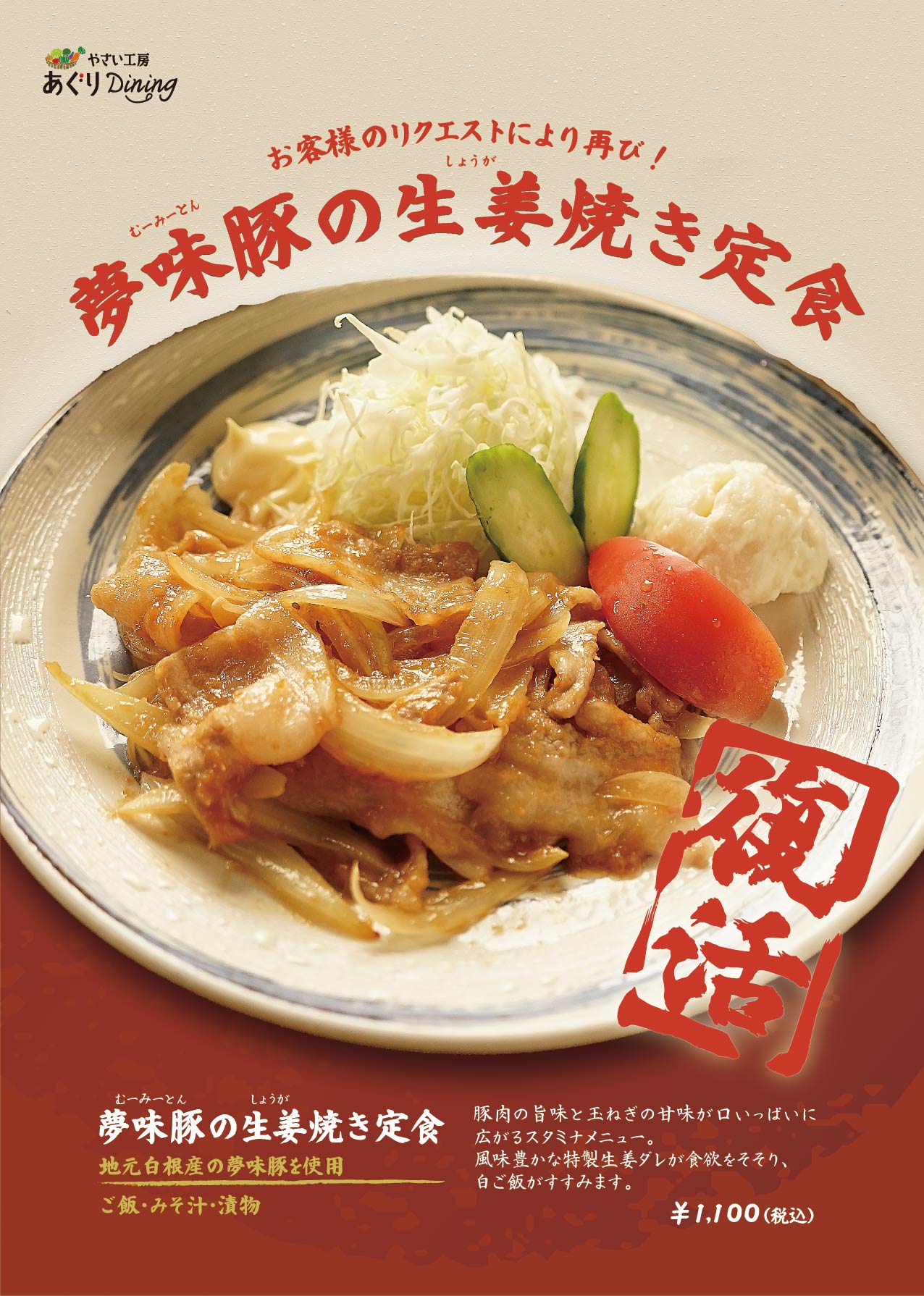 このたびお客様の声により 夢味豚の生姜焼き定食 1,100円(税込み) が復活します♪