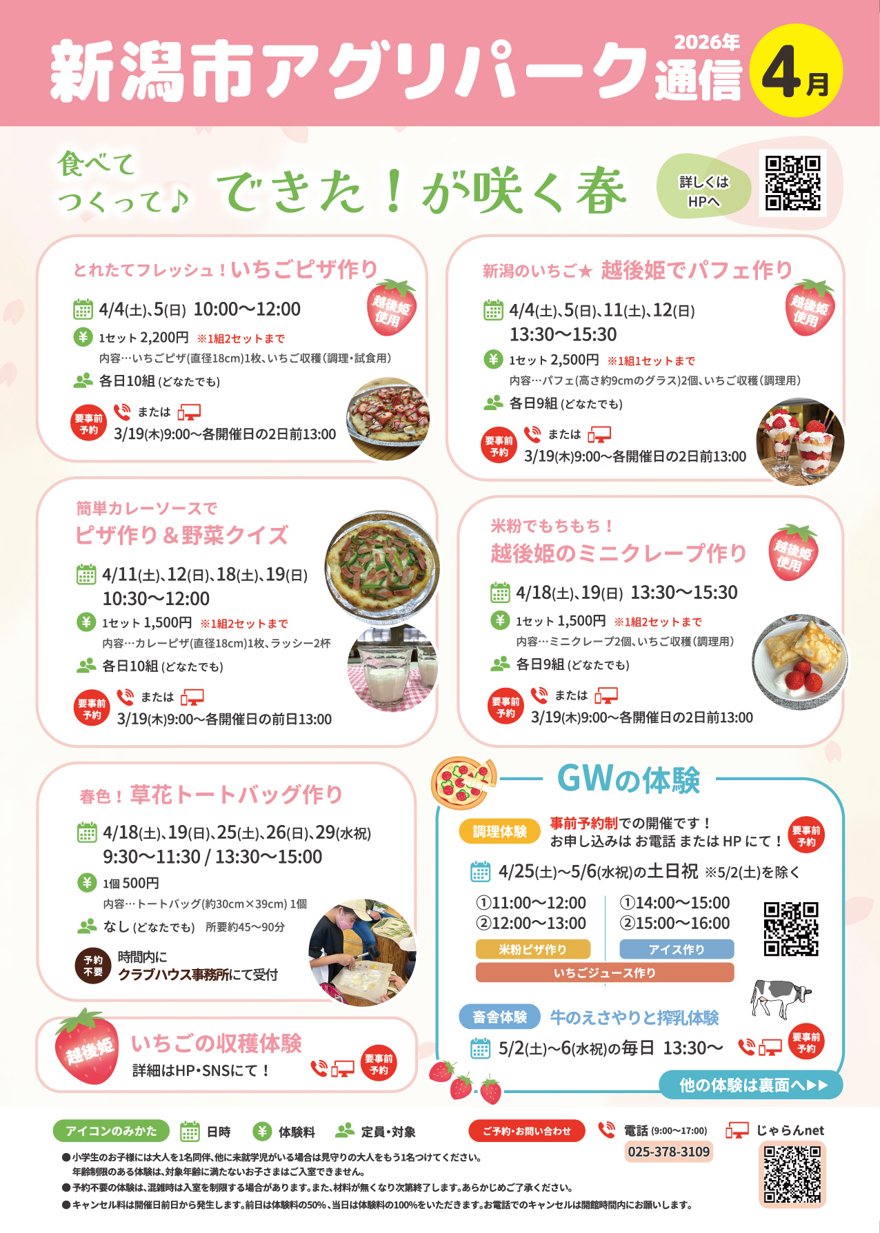 ※クリックで拡大します。4月のイベントカレンダーは、3月下旬に掲載予定です。 4月のアグリパークはいちご色!新潟のいちご「越後姫」を使った調理体験など、楽しいイベントが盛りだくさん! さらに、ヤギ・ヒツジの出産シーズンも始まります! 記号のみかた 【¥】体験料 【定】定員・対象 ※記載のないものは定員なし・どなたでも 【物】持ち物 ※記載のないものは不要 【会】会場 【申】申し込み ●4/4(土)、5(日) 10:00~12:00 とれたてフレッシュ! いちごピザ作り 甘くておいしい越後姫を、米粉入りのもちもち生地に乗せて、春ならではのピザを作ろう! 赤いいちごで見た目も華やか。 【¥】1セット2,200円 ※1組2セットまで 内容…いちごピザ(直径18cm)1枚、いちご収穫(調理・試食用) 【定】各日10組(どなたでも) 【物】エプロン、三角巾、ハンカチ、マスク 【会】受付・会場:体験ハウス 【申】要事前予約 3/19(木)9:00~各開催日の2日前13:00 お電話またはじゃらんnetにてお申し込みください。 ●4/4(土)、5(日)、11(土)、12(日) 13:30~15:30 新潟のいちご★ 越後姫でパフェ作り 収穫したての新鮮越後姫で、自分オリジナルのパフェ作り! 新潟限定の甘い魅力を堪能しちゃおう。 【¥】1セット2,500円 ※1組1セットまで 内容…パフェ(高さ9cmのグラス)2個、いちご収穫(調理用) 【定】各日9組(どなたでも) 【物】エプロン、三角巾、ハンカチ、マスク 【会】受付:クラブハウス事務所 会場:クラブハウス調理室 【申】要事前予約 3/19(木)9:00~各開催日の2日前13:00 お電話またはじゃらんnetにてお申し込みください。 ●4/11(土)、12(日)、18(土)、19(日) 10:30~12:00 簡単カレーソースでピザ作り&野菜クイズ 手作りカレーソースたっぷりの野菜ピザを作ろう!苦手な野菜もピザと一緒ならペロッと食べられちゃうかも…? 野菜クイズも開催!さらにラッシーも手作りできます! 【¥】1セット1,500円 ※1組2セットまで 内容…カレーピザ(直径18cm)1枚、ラッシー2杯 追加OK:野菜ピザ (S)900円、(M)1,300円 【定】各日10組(どなたでも) 【物】エプロン、三角巾、ハンカチ、マスク 【会】受付・会場:体験ハウス 【申】要事前予約 3/19(木)9:00~各開催日の前日13:00 お電話またはじゃらんnetにてお申し込みください。 ●4/18(土)、19(日) 13:30~15:30 米粉でもちもち! 越後姫のミニクレープ作り 米粉で作るクレープ生地はもちもち♪ 新潟自慢の越後姫を好きな形に切って、自分だけのオリジナルクレープを作っちゃおう! 【¥】1セット1,500円 ※1組2セットまで 内容…ミニクレープ2個、いちご収穫(調理用) 【定】各日9組(どなたでも) 【物】エプロン、三角巾、ハンカチ、マスク 【会】受付:クラブハウス事務所 会場:クラブハウス調理室 【申】要事前予約 3/19(木)9:00~各開催日の2日前13:00 お電話またはじゃらんnetにてお申し込みください。 ●4/18(土)、19(日)、25(土)、26(日)、29(水祝) 9:30~11:30 / 13:30~15:00 春色! 草花トートバッグ作り 春み~つけた♪好きな草花を摘んで、トートバッグに叩いて染めよう! いつも見ている葉っぱの色が出るのかな? 【¥】1個500円 内容…トートバッグ(約30cm×39cm)1個 【会】受付:クラブハウス事務所 会場:クラブハウス学習室 【申】予約不要 受付時間内にクラブハウス事務所にお越しください。 ●4月の土日祝 いちごの収穫体験 【申】要事前予約 ※開催時間・体験料などの詳細は、後日HP・SNSにてご案内いたします。 ●GW(ゴールデンウィーク)の体験 【調理体験】米粉ピザ、アイスクリーム作り アグリパークで人気の野菜たっぷりピザ、フレッシュな牛乳でつくるアイス作り! 事前予約制での開催となります。 【日時】4/25(土)~5/6(水祝)の土日祝 ※5/2(土)を除く 【開催時間】 〈米粉ピザ作り〉 ①11:00~12:00 ②12:00~13:00 〈アイスクリーム作り〉 ①14:00~15:00 ②15:00~16:00 【申】要事前予約 お電話またはご予約フォームからお申し込みください。 【畜舎体験】牛のえさやりと搾乳体験 通常は土日祝での開催のところ、GW期間中は毎日開催します! 牛さんと近くで触れ合って、命の大切さを感じよう。 【日時】5/2(月)~6(水祝)の毎日 13:30~ ※所要:最大60分 【¥】1名600円 【定】各日25名(4歳以上) 【会】受付:クラブハウス事務所 会場:体験畜舎 【申】要事前予約 当日13:00まで お電話またはじゃらんnetにてお申し込みください。 注意事項 〈調理体験について〉 ・小学生のお子様には大人を1名同伴、他に未就学児がいる場合、見守りの大人をもう1名つけてください。 ・年齢制限がある場合は、対象年齢に満たないお子さまはご入室できません。 ・すべての調理体験は、衛生面および安全面の観点によりお持ち帰りいただけません。 〈すべての体験について〉 ・小学生以下のお子様には大人の同伴が必要です。 ・予約不要の体験は混雑時は入場制限があります。また、材料がなくなり次第終了しますのでご了承ください。 ・キャンセルの場合は必ずご連絡をお願いします。キャンセル料は開催日の前日から発生します。前日は体験料の50%、当日は体験料の100%をいただきます。お電話でのキャンセルは、開